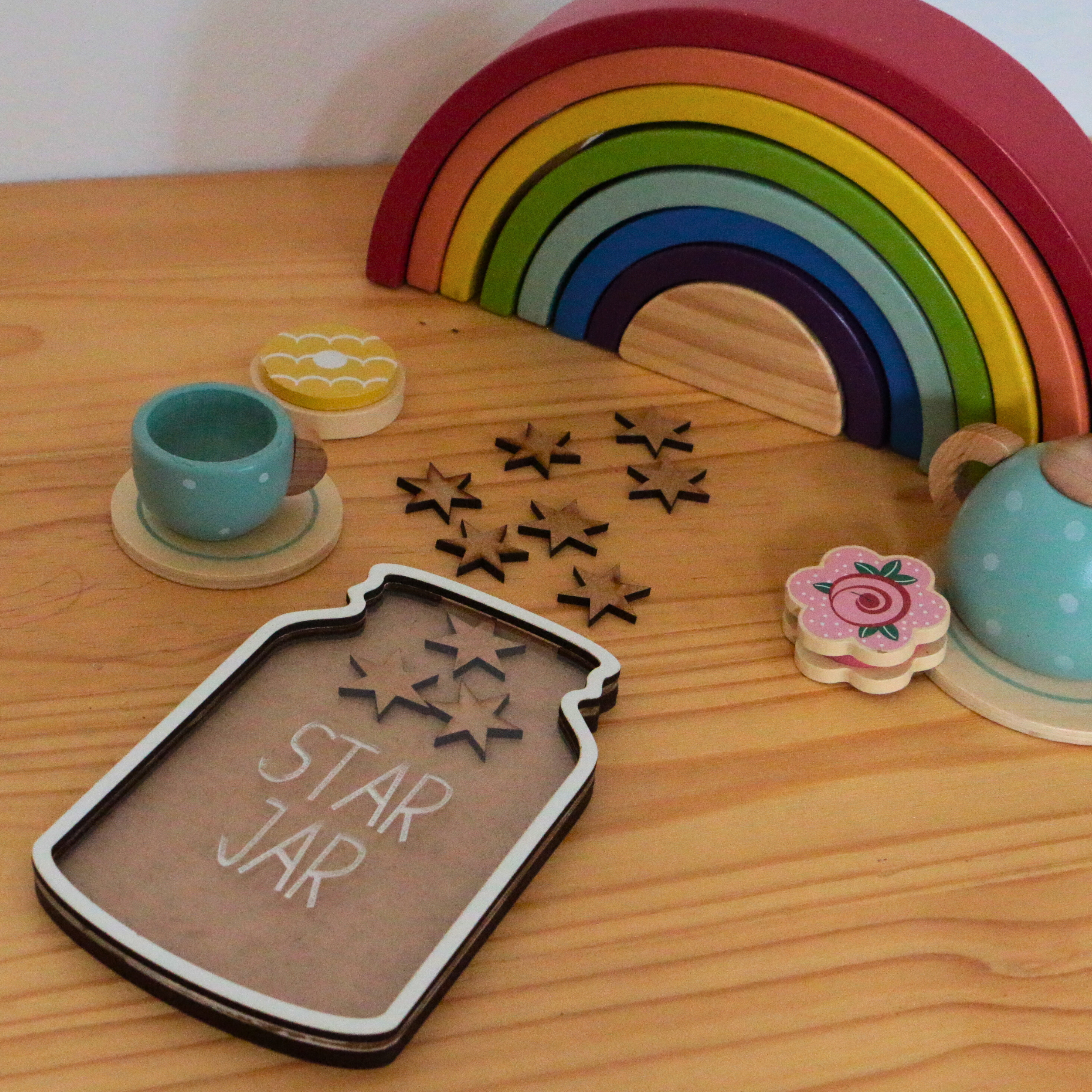 Material: 3mm MDF colour with clear acrylic and 20x gold/silver stars